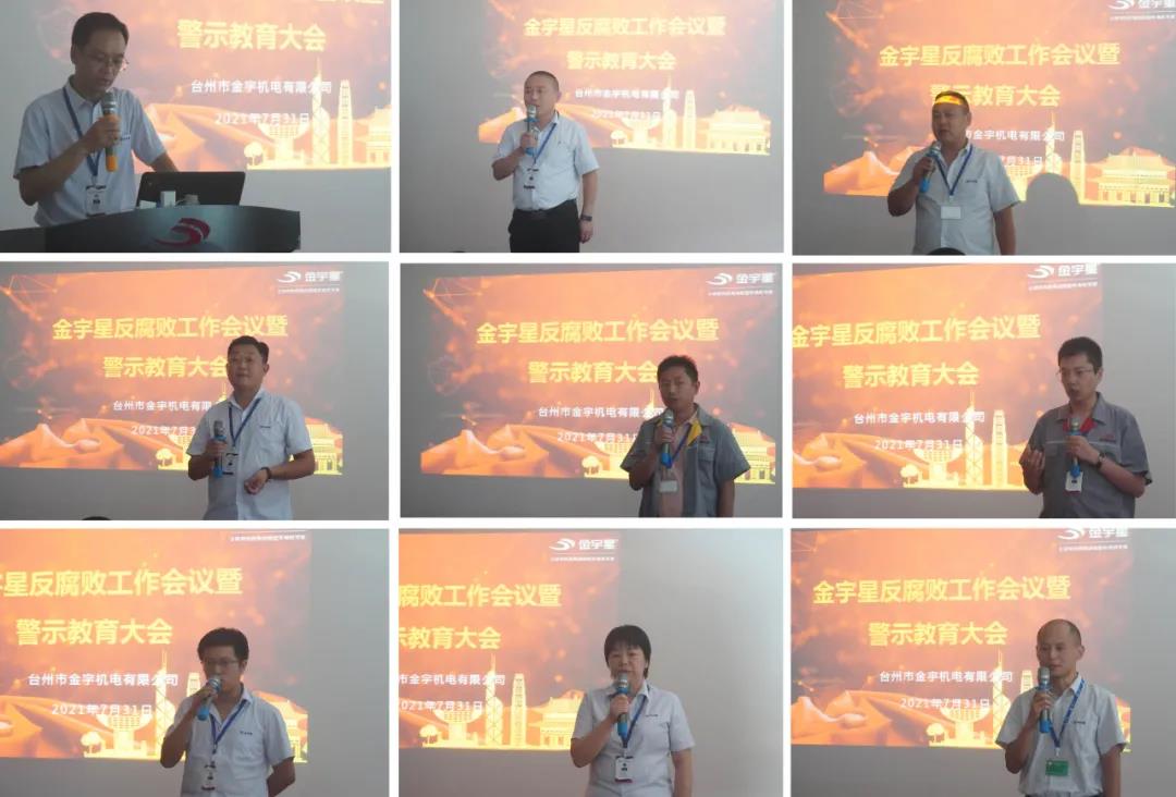 7月31日下午,為進(jìn)一步貫徹落實(shí)公司反腐敗、反賄賂工作的部署,營造風(fēng)清氣正的發(fā)展環(huán)境,堅(jiān)定不移地推動(dòng)反腐敗和廉潔自律工作向縱深發(fā)展,金宇星在黃巖總部召開了反腐敗工作會(huì)議暨警示教育大會(huì),全體管理人員及關(guān)鍵核心崗位120余人參加,董事長王加許發(fā)表了重要講話并明確指示,對腐敗實(shí)行零容忍,任何人都不允許觸及此高壓線,會(huì)議分為四個(gè)議程展開。