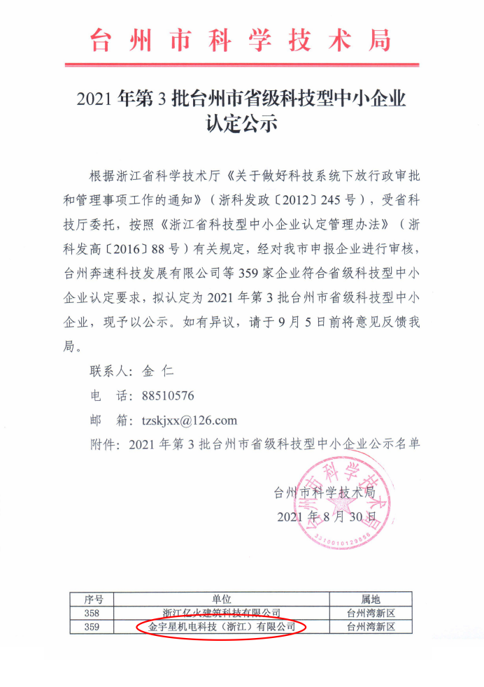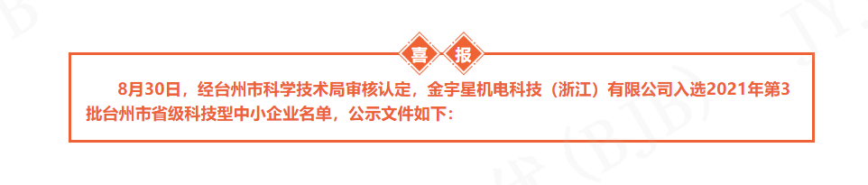 金宇星臺州灣新廠入選2021年第3批臺州市省級科技型中小企業名單